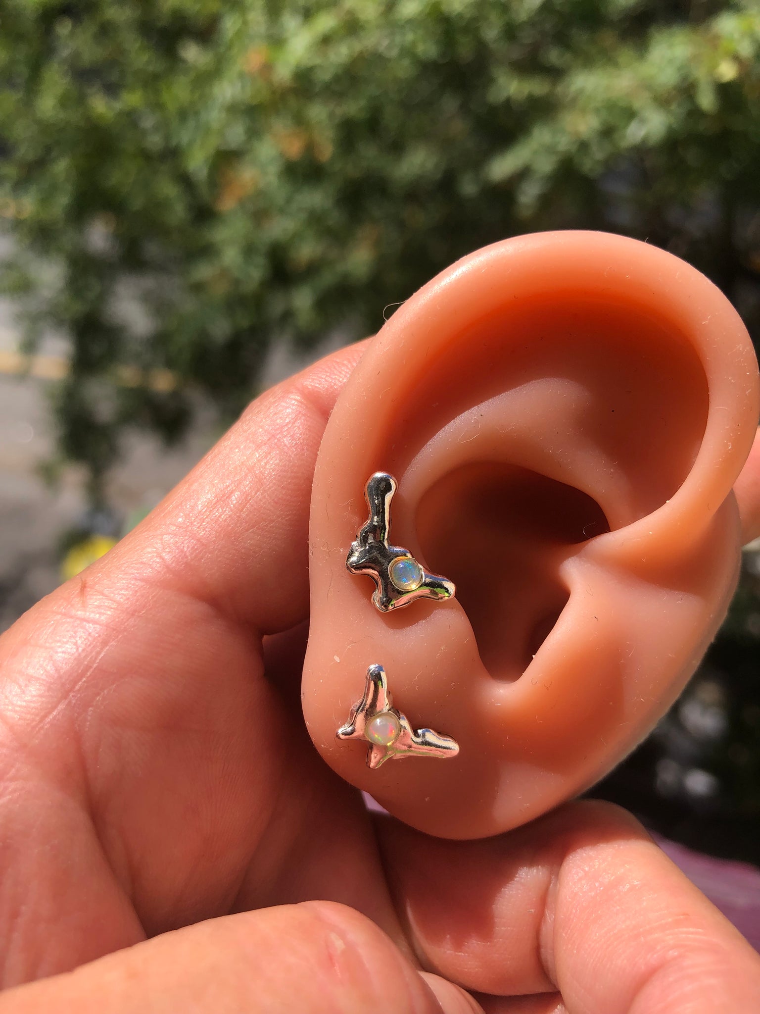 Clous d'oreilles de formes organiques en argent ou en vermeil, avec une perle ou un petit cabochon opale. Chaque modèle est différent, oreille droite ou oreille gauche. Vendus à l'unité ou par paires.